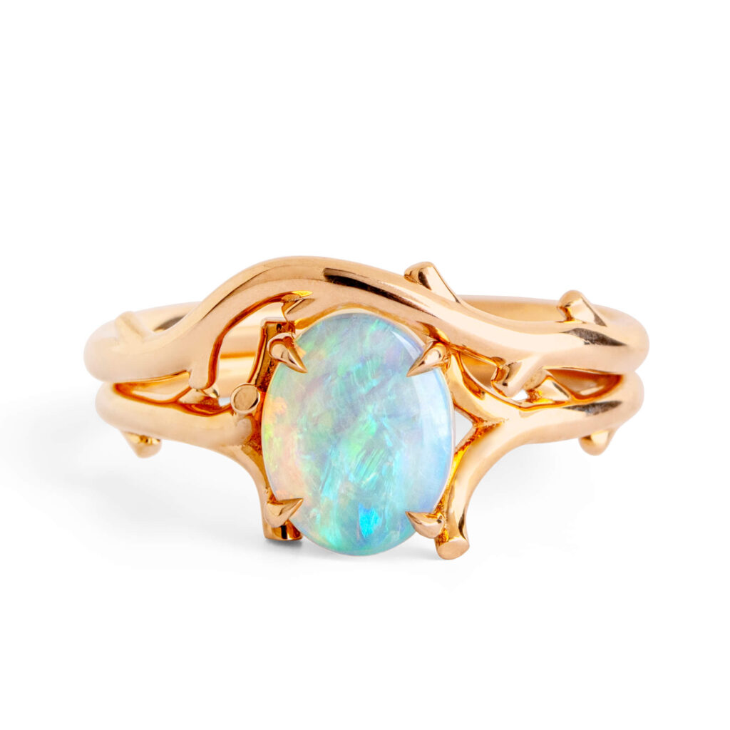 Oval Rose Quartz Twig and Leaves Engagement Ring