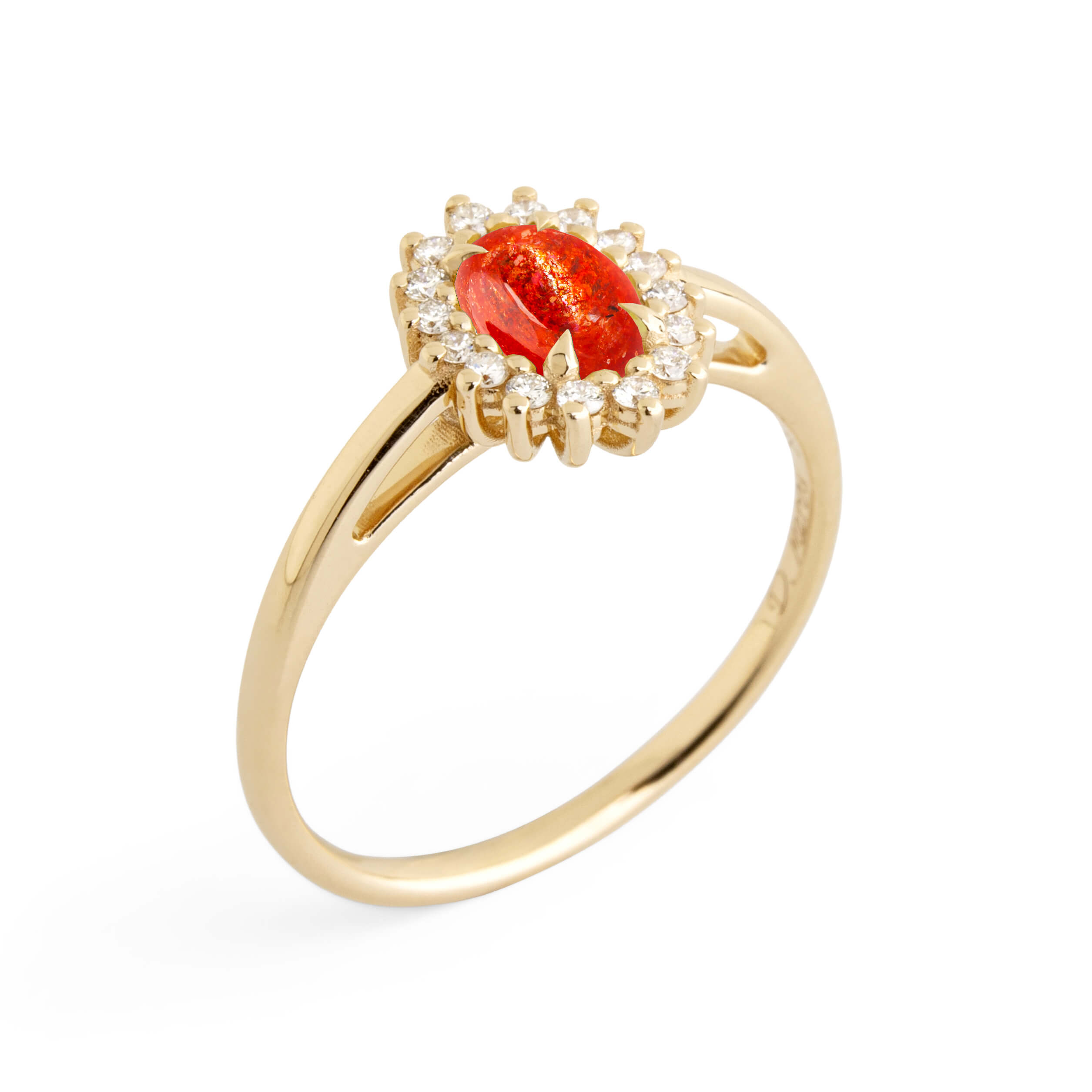 A dainty handmade Sunstone and Diamonds Halo Engagement Ring set with a 4mmX6mm oval, sunstone of high quality, and a halo of natural, accent diamonds.