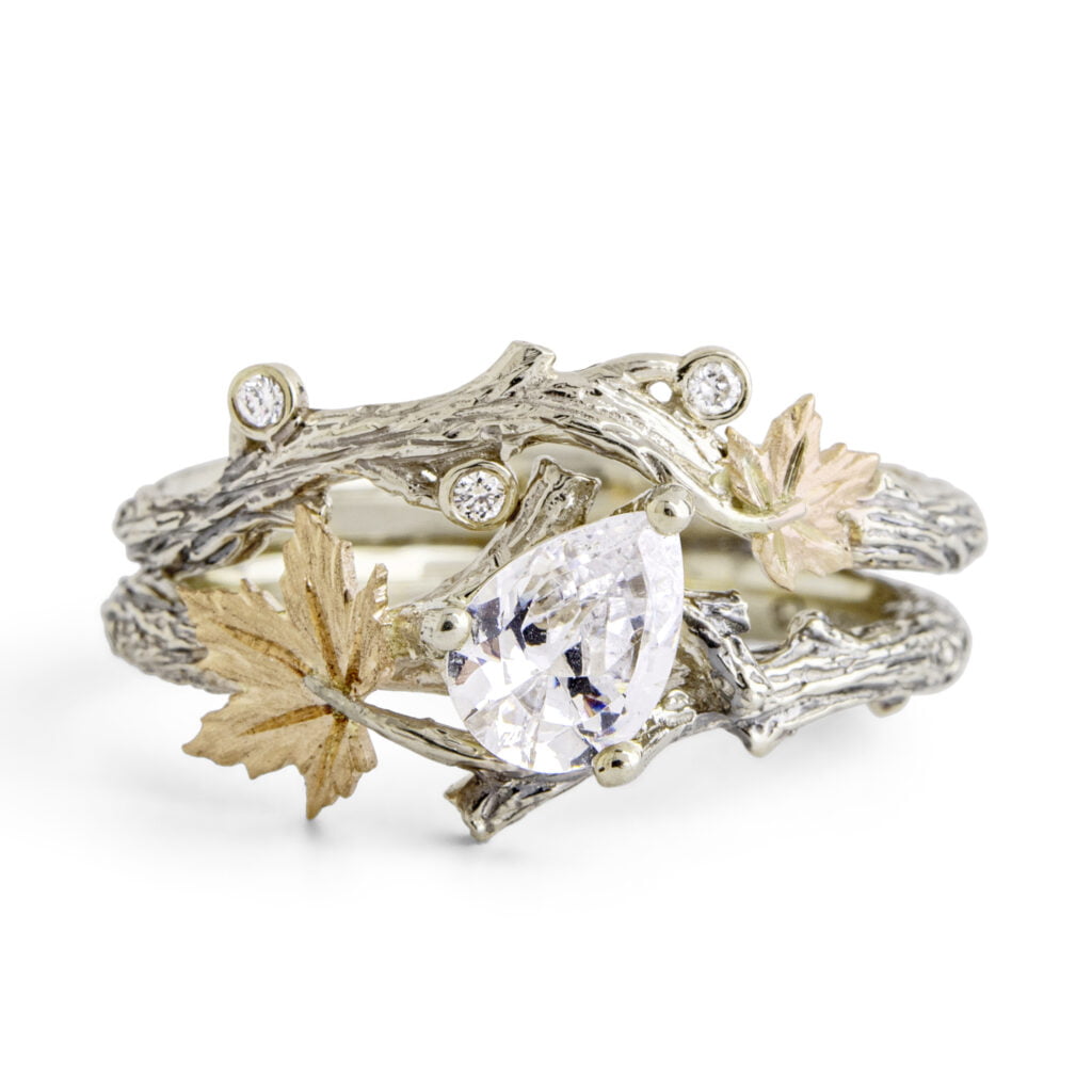 A handmade maple leaf bridal set with a natural Moonstone and diamonds.
